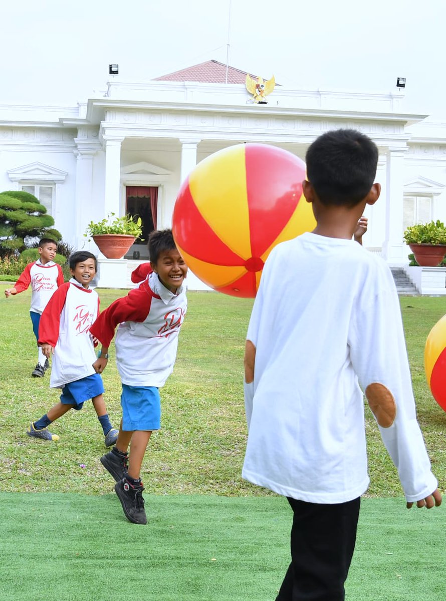 Keceriaan tak dapat disembunyikan dari wajah anak-anak yang meramaikan halaman tengah Istana Merdeka saat Presiden @jokowi dan Ibu Negara Iriana menghabiskan waktu untuk saling bertegur sapa, bermain, dan bernyanyi bersama anak #JokowiSayangiAnakIndonesia #HariAnakNasional2018